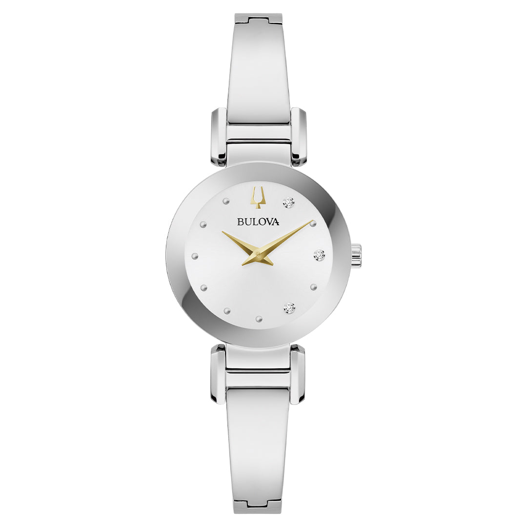 Bulova Marc Anthony Collection women's watch. Three individually hand-set diamond hour markers. Two-hand quartz movement. Stainless steel case and bracelet with a jewelry-style clasp. Silver dial,...Regular price $737.13 USDSale price $737.13 USD Regular priceUnit price / per -