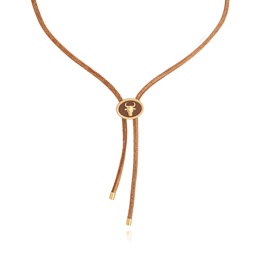 Esta elegante corbata bolo presenta un cordón de cuero natural texturizado en un cálido tono marrón. El cordón se sujeta mediante una corredera ajustable, el elemento decorativo central de la pieza. Esta corredera es un medallón ovalado con un marco de oro pulido. El centro del medallón presenta un material marrón rojizo, posiblemente esmalte o piedra natural, que sirve de fondo para una detallada cabeza de toro de oro pulido. La cabeza de toro presenta cuernos prominentes y una silueta definida, lo que le aporta un toque audaz de inspiración western. Los extremos del cordón de cuero están rematados con elegantes puntas de oro pulido, lo que realza la refinada apariencia de este accesorio único.