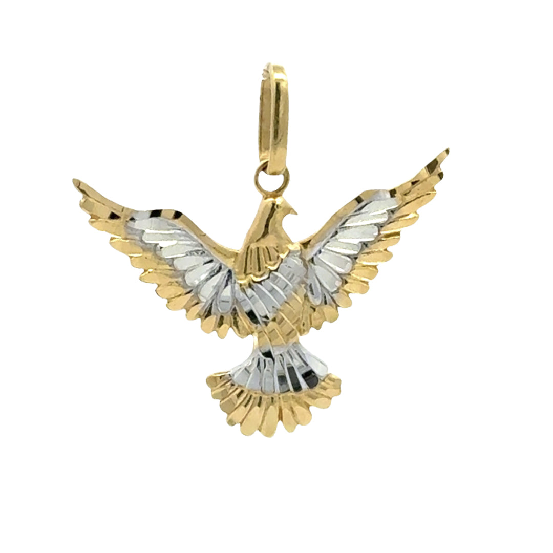 este es un detallado dije que representa al espíritu santo en la forma de una paloma con las alas extendidas, elaborado en oro macizo de 18 quilates. la pieza es notable por su técnica de oro bicolor, donde el cuerpo y las partes principales de las alas son de oro amarillo, mientras que las plumas están resaltadas con oro blanco, creando un contraste visual muy elegante. el acabado texturizado o facetado de las alas le otorga movimiento y brillo, haciendo de este colgante un poderoso y moderno símbolo de fe.