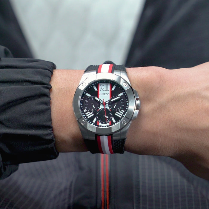 El GW0716G1 es un elegante reloj para hombre de GUESS. Presenta un diseño en tono negro y plateado con un diámetro de caja de 44 mm y una correa de silicona. El reloj tiene una esfera multifunción y es resistente al agua hasta 50 metros, lo que lo hace adecuado para el uso diario, pero no para nadar o bucear.