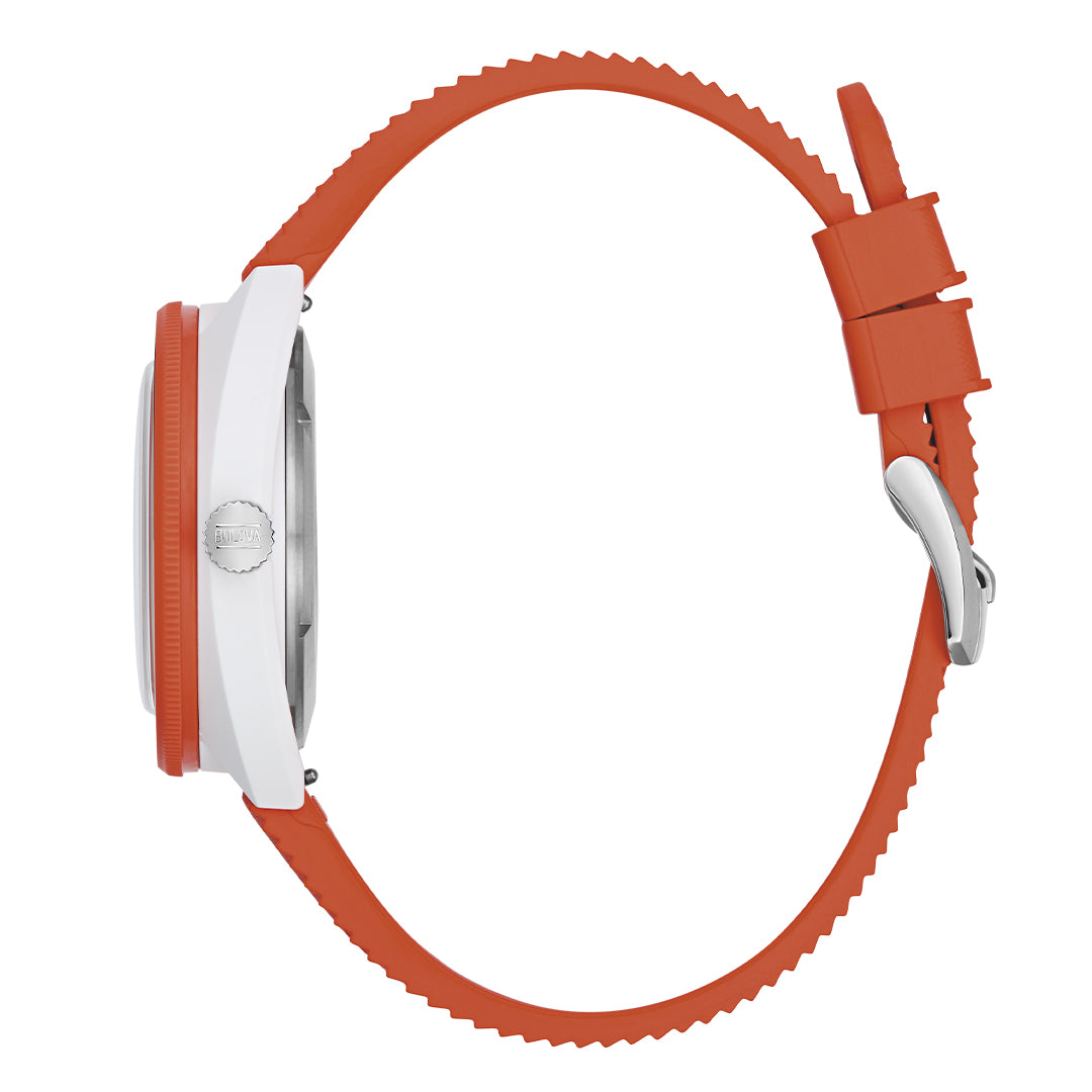 Continuando la tradición de innovación y artesanía fina de Bulova, nuestra nueva colección Snorkel combina un diseño de inspiración vintage con un toque moderno y fresco. El renovado Bulova Snorkel comparte ADN con el icónico Oceanographer a través de su clásica pero reconocible forma de caja. En vibrantes tonos inspirados en la vida marina, cada reloj de 41 mm presenta una caja de forma retro hecha con la innovadora Cerámica Híbrida, un material compuesto de lujosa suavidad y mayor durabilidad. La esfera con diseño de olas y la impactante caja híbrida de este modelo combinan a la perfección con un bisel unidireccional naranja con inserto bicolor y un fondo de caja grabado con la imagen de un pez payaso, que rinde homenaje a sus raíces oceánicas. Con agujas y marcadores plateados con relleno luminiscente, indicador de fecha y correa de caucho perforada naranja a juego, el Snorkel para hombre encarna un diseño atemporal. Con resistencia al agua de 100 m, equilibra a la perfección estilo y funcionalidad con el legado de Bulova en la relojería icónica.